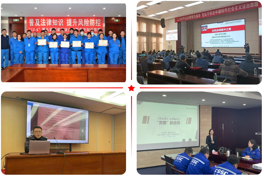 ▲ 江南造船、中船九院、重齒公司、河柴重工、江淮重工、七〇八所、七〇九所、七一六所等單位通過線上與線下相結合的方式開展法律知識競賽;七一七所、七二二所等單位拍攝制作普法微視頻;中船澄西、中船財務、中船投資、物資公司、各平臺型上市公司、中船綠洲、中船風電、漢光重工、長江科技、七一〇所、七一一所、上船院等多家單位舉辦專題法治講座;七六〇所舉辦民法典熱點問題交流沙龍;八院組織業務部門重點崗位人員旁聽庭審。