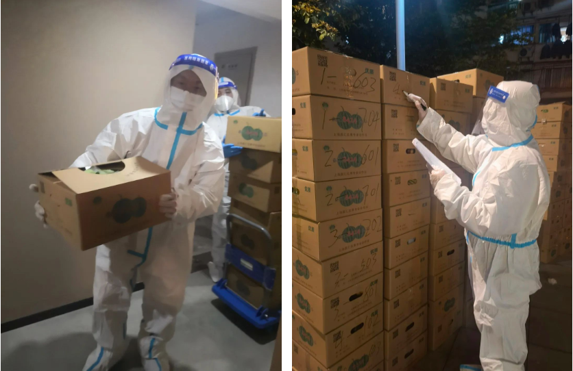 由于防護服有限,居住在黃浦區某社區的集團職工中只有鄭珂成了志愿者,只見他時而忙著卸貨分裝,時而忙著打包標記,7棟樓近400戶居民共計幾百公斤的物資,都由他一人完成了分裝和標記工作。在他服務的對象中,既有身在涉疫樓棟無法出戶的同事,也有素未謀面的鄰居。