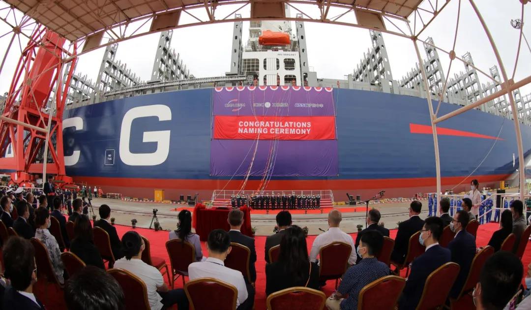 8月27日,由中國船舶集團有限公司旗下滬東中華聯合中船貿易為法國達飛海運集團建造的15000TEU超大型集裝箱系列船首制船“達飛·和風”號命名交付。這是中法兩國船海巨頭全面落實2019年中國國家主席習近平和法國總統(tǒng)馬克龍見證簽署的戰(zhàn)略合作框架協(xié)議的最新成果。同時,也標志著“CSSC超大型箱船譜系”又添“新丁”,實現了對全球超大型集裝箱船發(fā)展的引領。