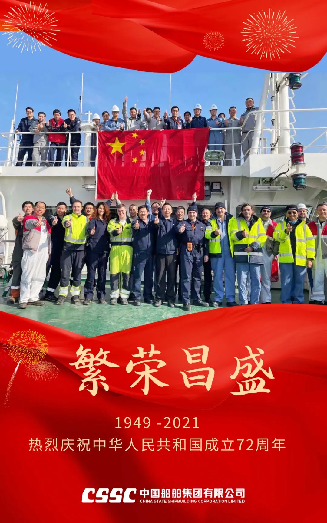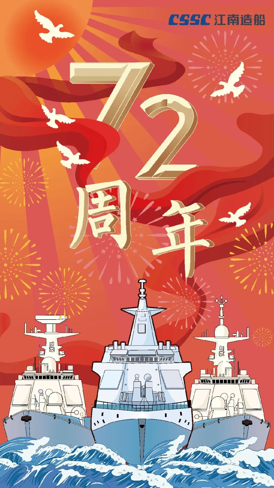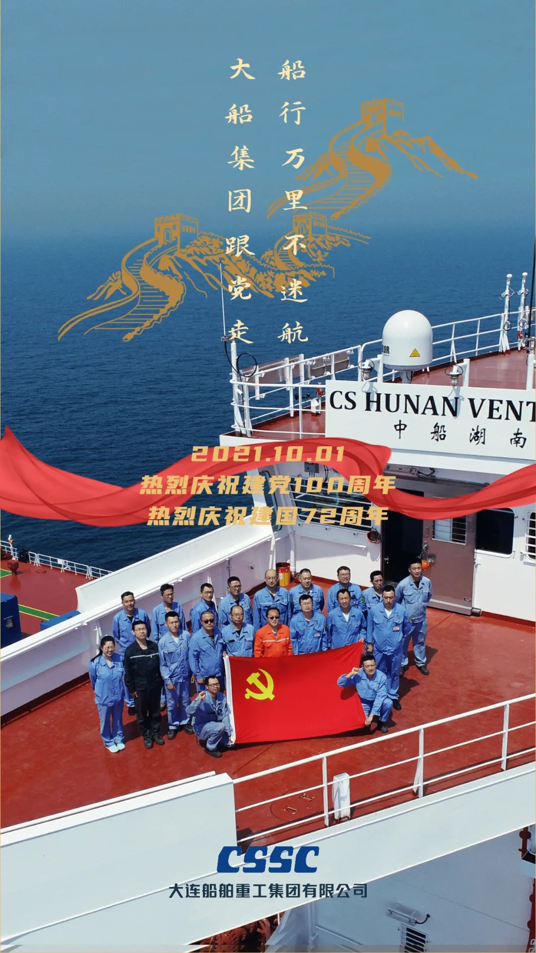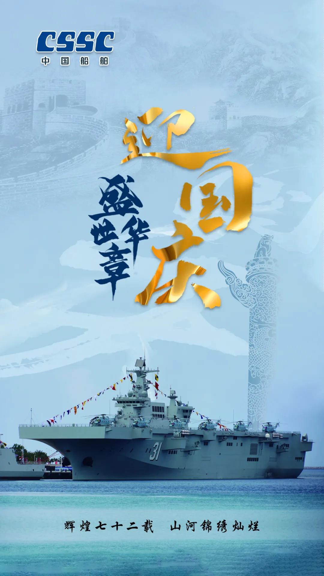 今天,我們迎來新中國72周年華誕。作為我國海軍裝備建設的主力軍,中國船舶大船集團將不忘初心,牢記使命,堅定貫徹海洋強國、制造強國、科技強國國家戰略,聚焦主責主業、聚力興裝強軍,為實現中華民族偉大復興的中國夢而不懈奮斗。