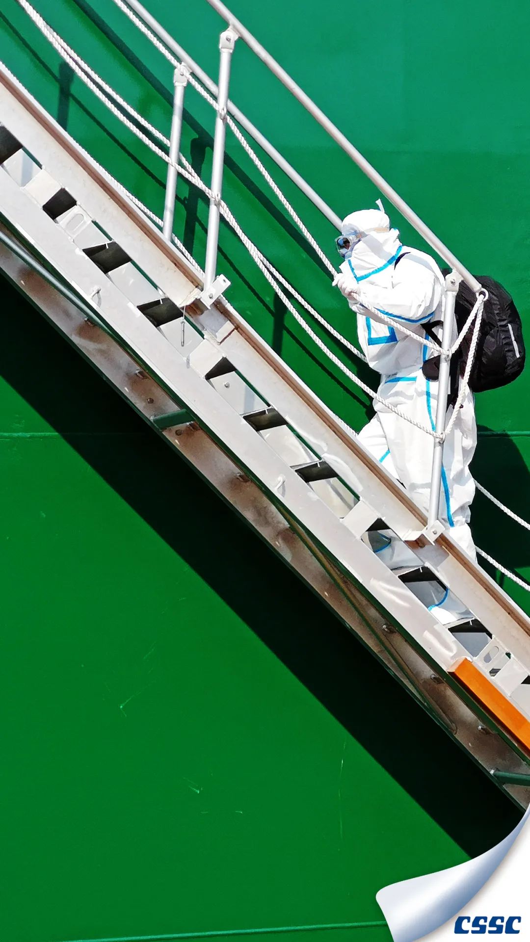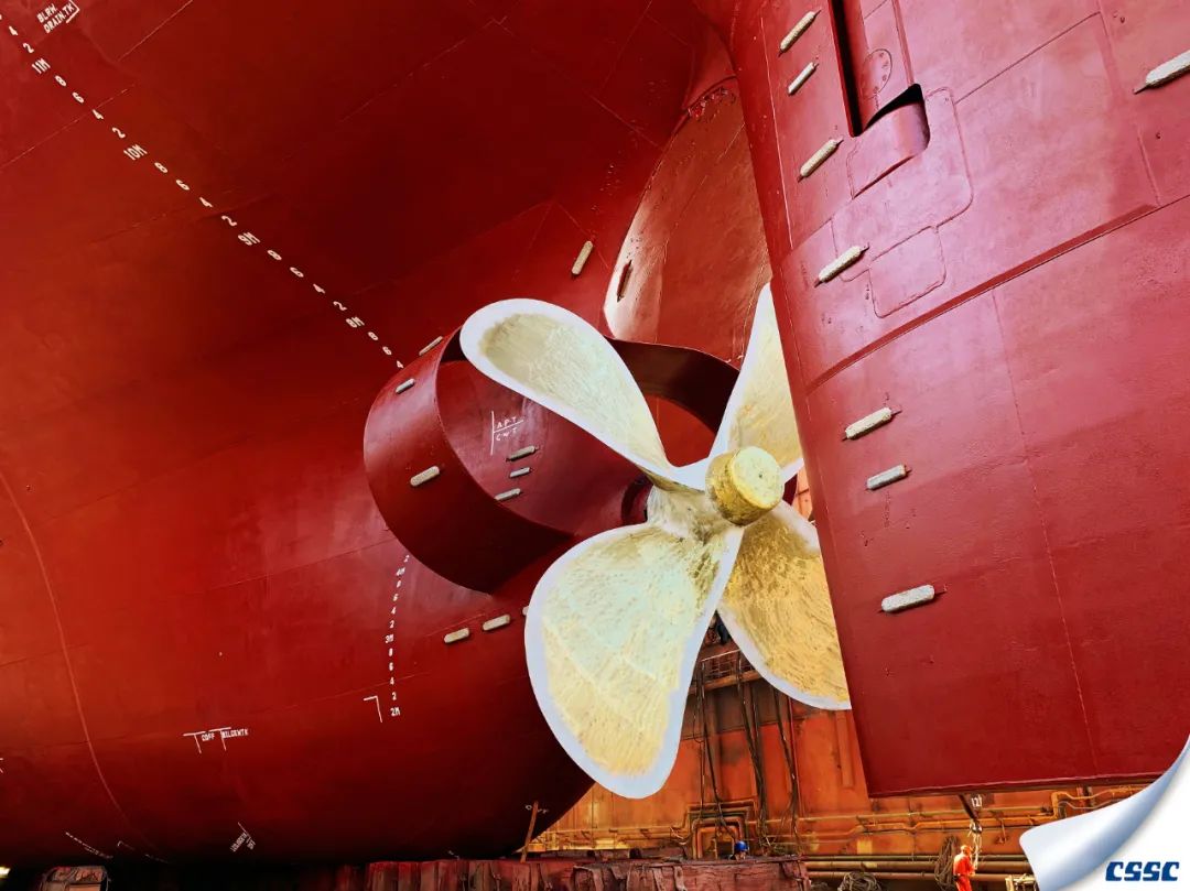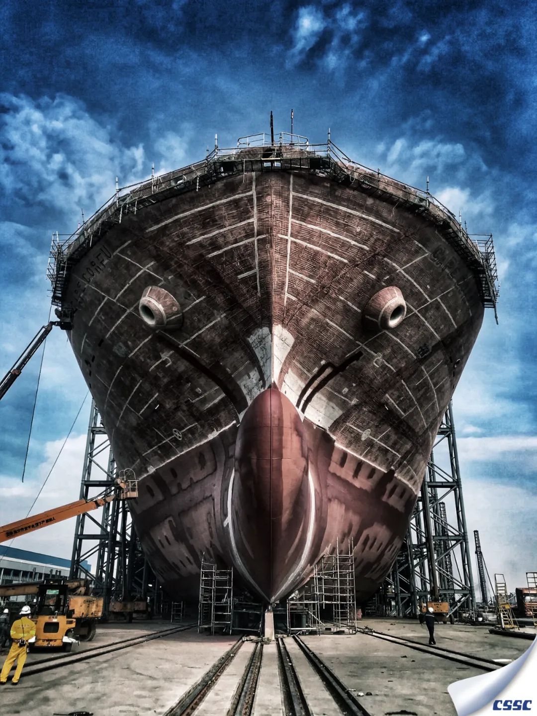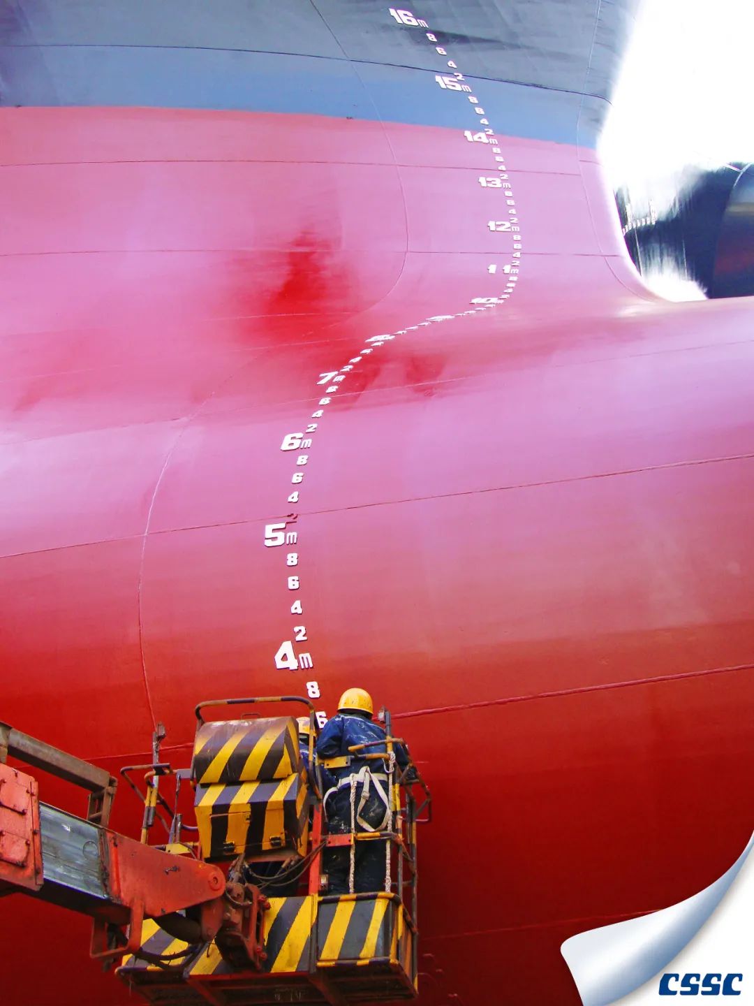 該片拍攝于中船澄西金山塢內MARITIME VANESSA (HONGKONG)  船進塢油漆涂裝和螺旋槳修理作業時,創作主要利用船舶與現場作業人物大小形成超大反差,以獨特的視角展現了涂裝后新船的雄偉和迷人色彩。