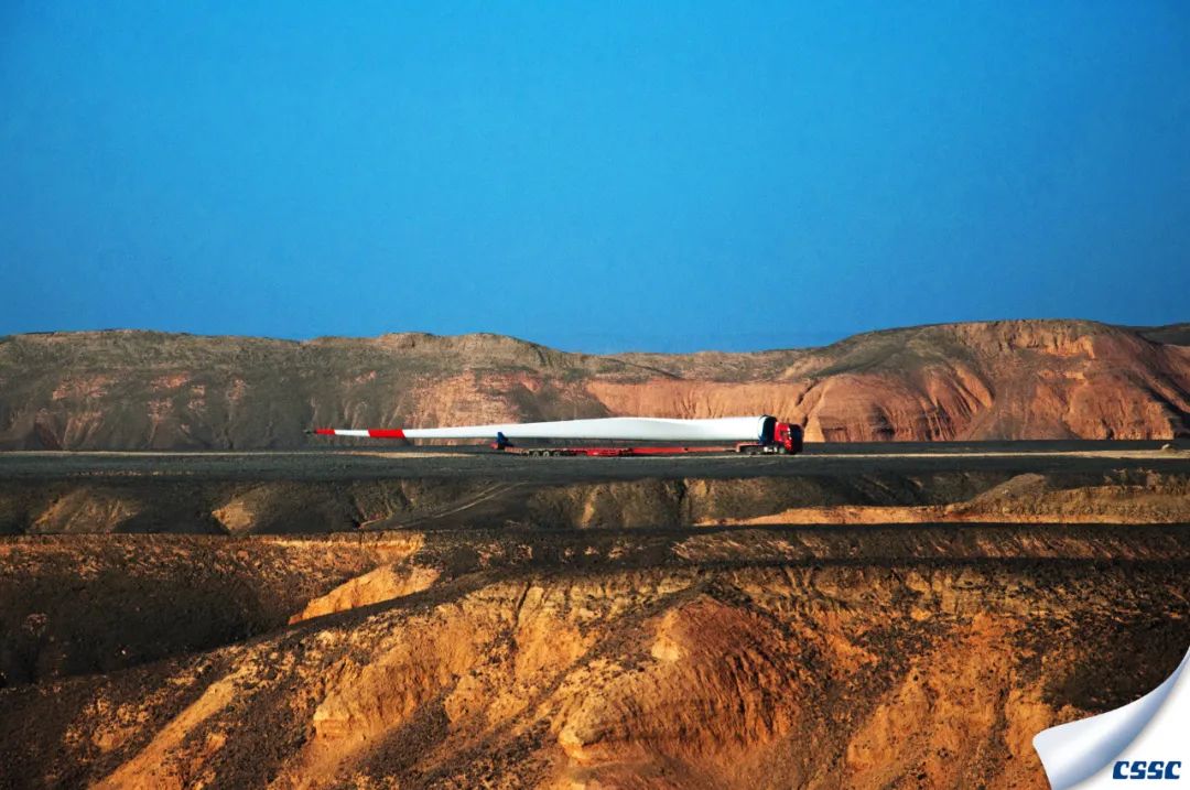 虎年開年, 中國海裝首臺H155-5MW機組在百里風區——新疆哈密成功完成吊裝,該機組是新疆哈密目前單機容量最大的風電機組。圖為超大型風葉運輸過程的縮影。