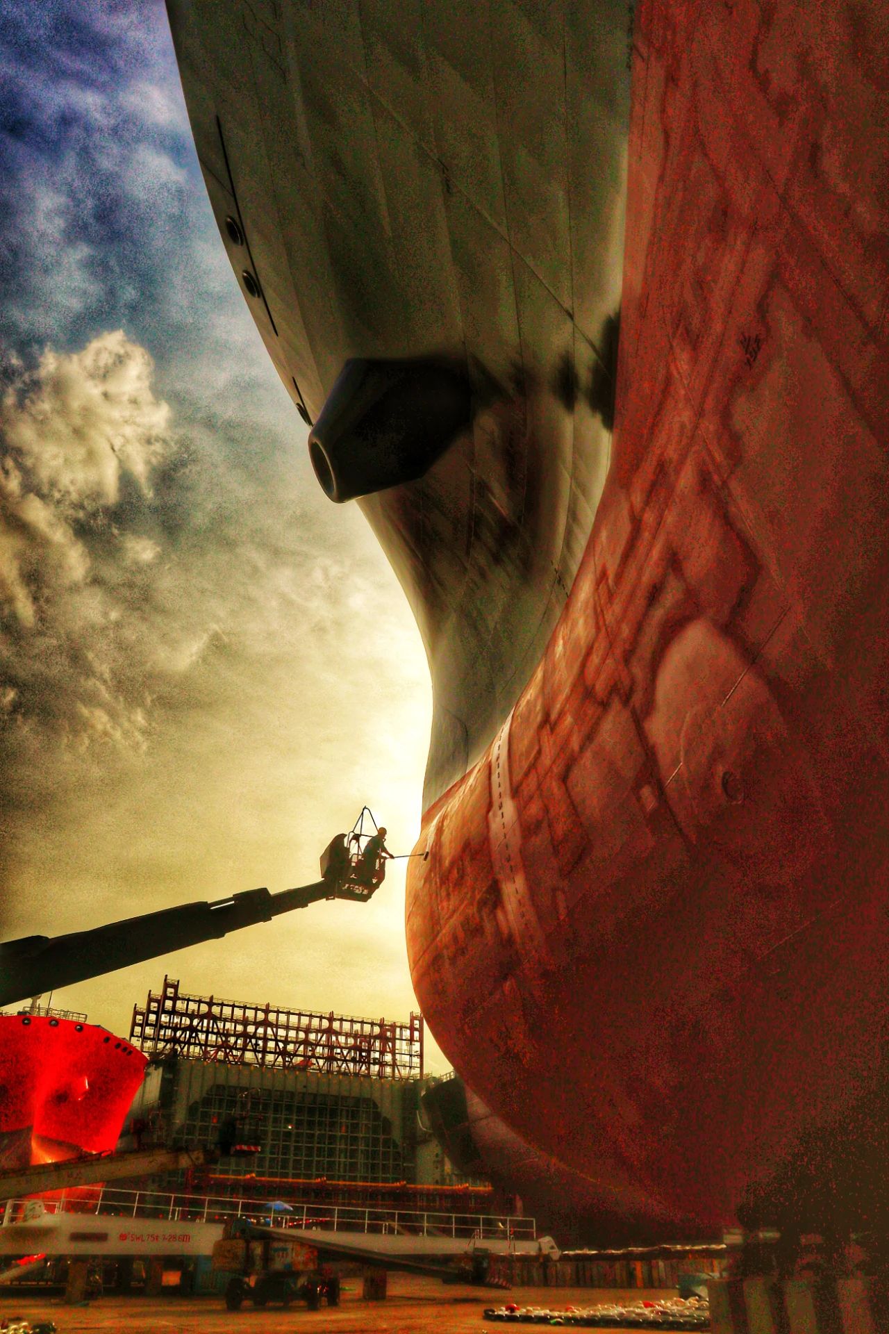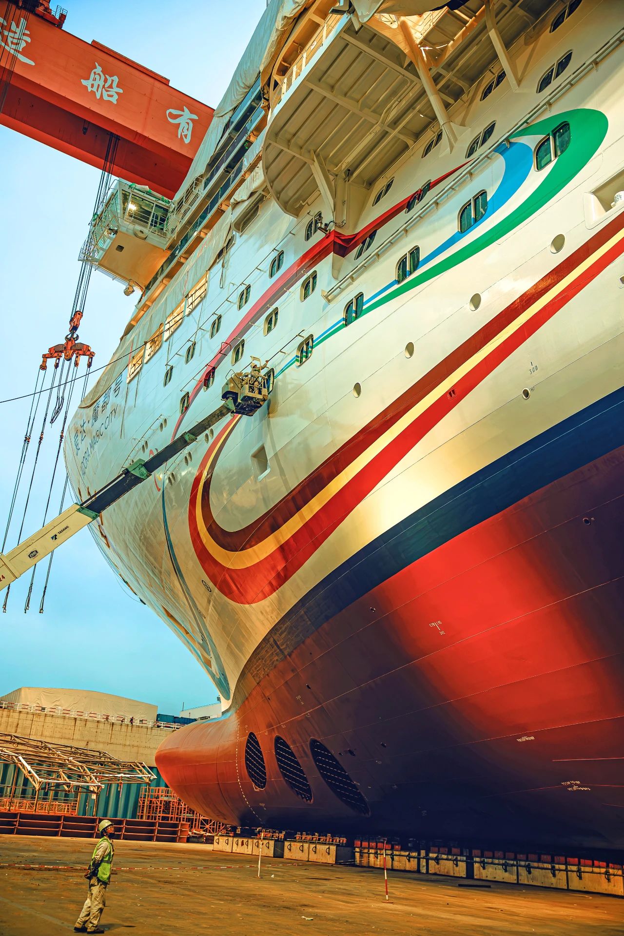 壯麗的船身如山巒一般,余暉映襯下,一位工人正駕駛高空車完成外板清潔施工,構(gòu)成一幅絕美的畫面。