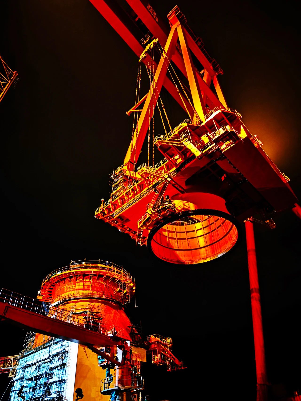 在武漢船機(jī)平臺總裝現(xiàn)場,華夏金租神大平臺配套的1200噸起重機(jī)正在安裝,大件吊裝各項準(zhǔn)備工作繁瑣,一切就緒時,天已經(jīng)黑了,現(xiàn)場一鼓作氣開始吊裝對接,展現(xiàn)了船舶人只爭朝夕、不負(fù)韶華、忘我工作精神風(fēng)貌。