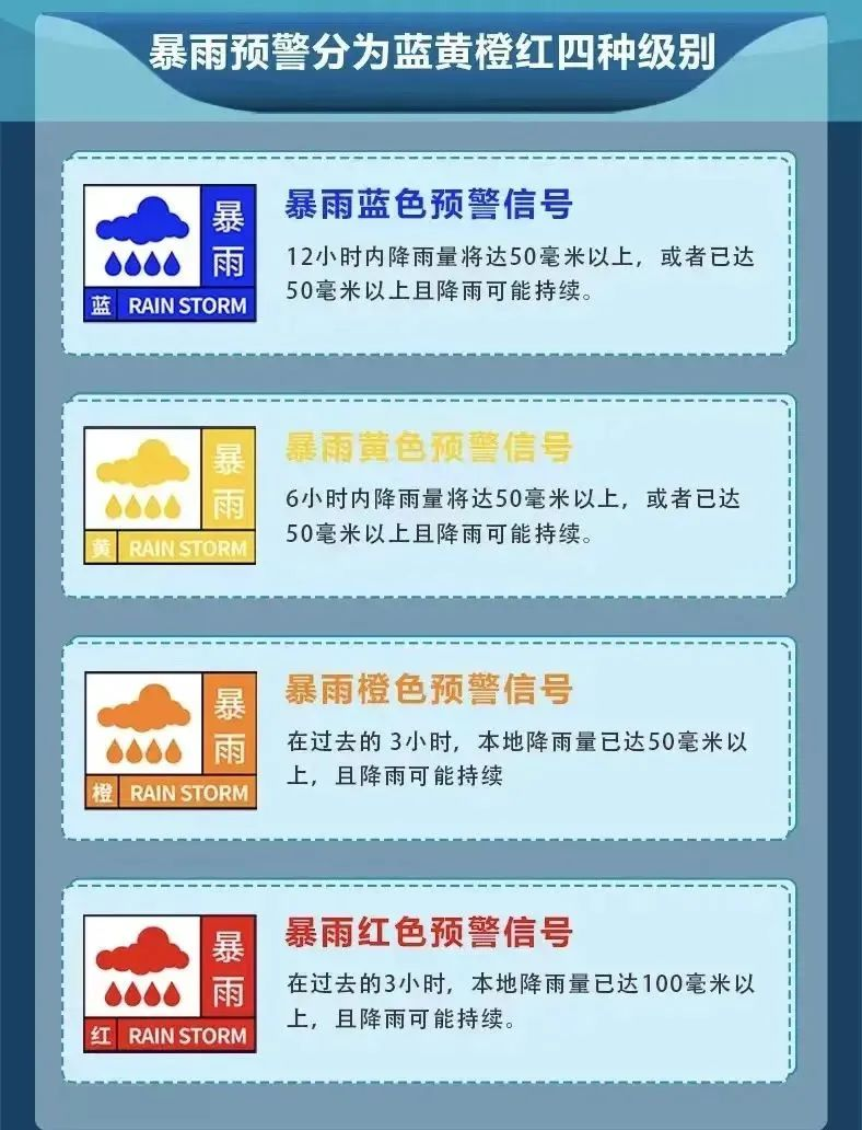 暴雨預(yù)警信號是氣象部門通過氣象監(jiān)測,在暴雨到來之前做出的預(yù)警信號,暴雨預(yù)警信號分四級,分別以藍色、黃色、橙色、紅色表示。