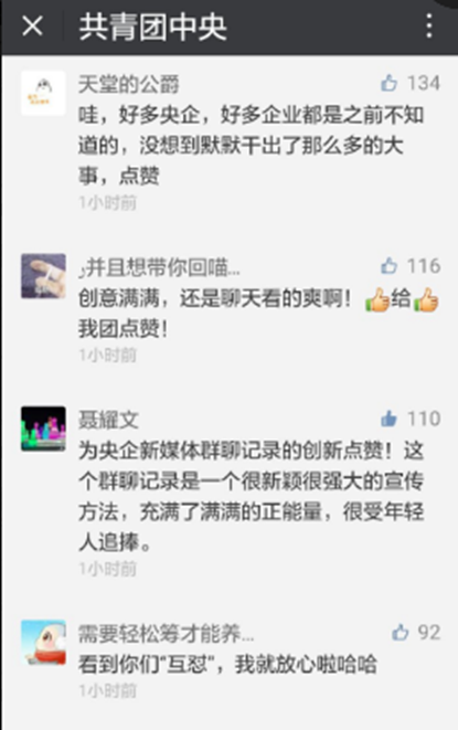 “‘央企新媒體群聊記錄’刷屏是央企新媒體親民傳播風格的正向反饋,能引發(fā)受眾共鳴的話題加上激發(fā)和感染的受眾,從而引發(fā)了積極的再傳播力量”,人民網(wǎng)輿情監(jiān)測室常務副秘書長單學剛同樣不諱受眾在其中的作用。