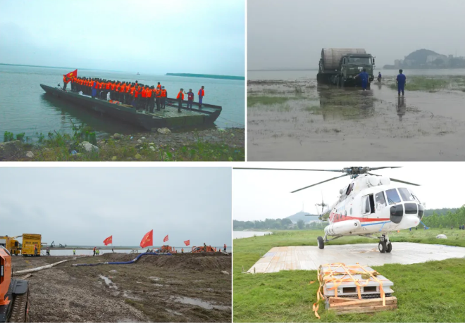 ????在搜救環節,中船應急搶險隊架設動力舟橋和硬質機動路面進行道路搶通,保障重型裝備及人員進場;在內澇搶排環節,采用應急泄流虹吸裝備和履帶式排澇機器人參與排澇搶險;在重大險情處置環節,鋪設應急直升機停機坪保障直升機起降,并實施潰口封堵作業。