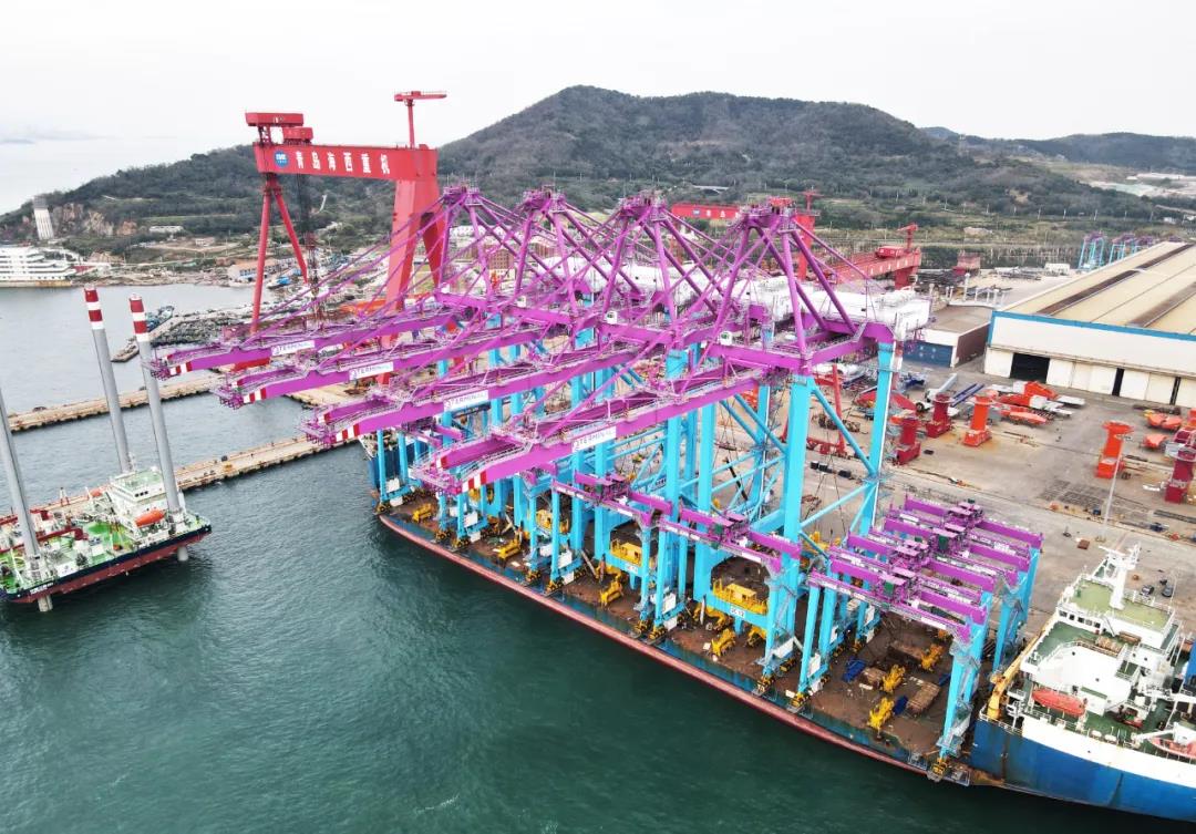 近日,武漢船機海西重機為卡塔爾哈馬德新港二期打造的4臺岸橋、10臺輪胎起重機從青島西海岸新區啟運。