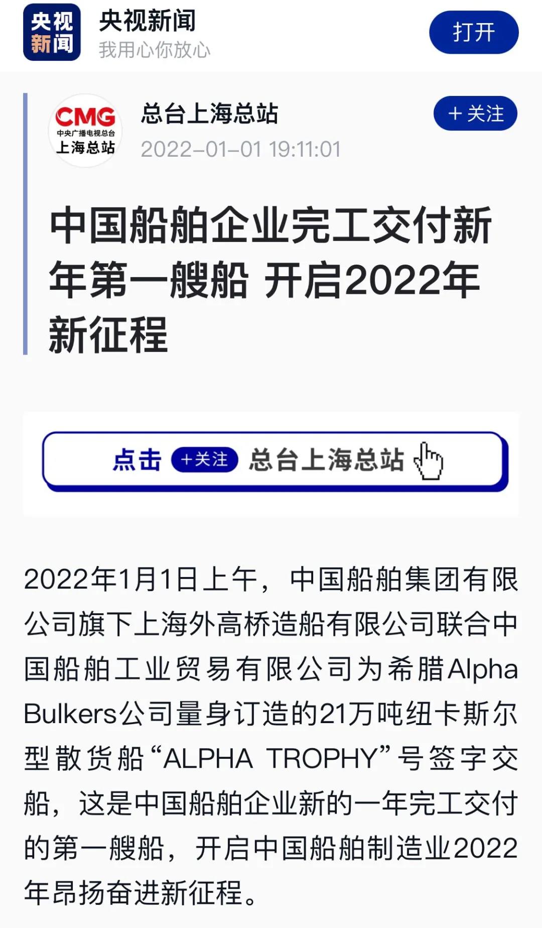 1月1日上午,中國船舶集團(tuán)旗下外高橋造船聯(lián)合中船貿(mào)易建造的21萬噸紐卡斯?fàn)栃蜕⒇洿癆LPHA TROPHY”號簽字交船,這是中國船舶企業(yè)新的一年完工交付的第一艘船,開啟中國船舶制造業(yè)2022年昂揚(yáng)奮進(jìn)新征程。