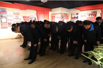 在張進(jìn)同志先進(jìn)事跡展覽室里鞠躬默哀