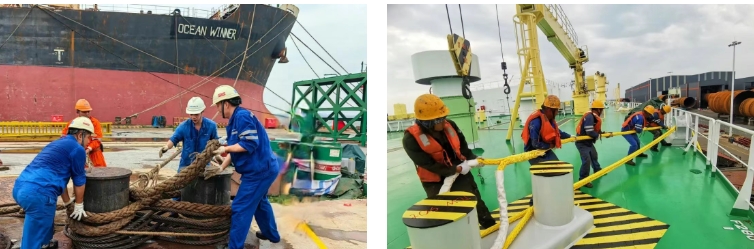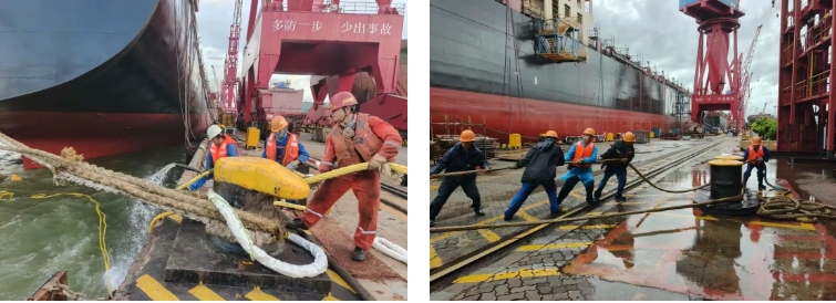 臺風肆虐時,組織管理人員抗臺值守,以“臺風不撤,我們不撤”的原則堅守一線。臺風預警解除后,10小時內完成登船梯搭設及纜繩解除,迅速恢復正常生產。憑借科學預案與堅守,最終實現纜繩零斷裂、船舶零移位,有力保障了生命財產安全。