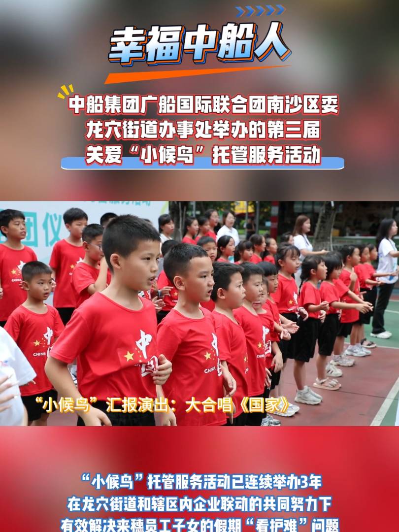 廣船國際“小候鳥”托管服務(wù)活動已連續(xù)舉辦3年,切實有效解決了來穗員工子女的假期“看護難”問題,提高員工扎根南沙、逐夢南沙的歸屬感與幸福感,是廣船國際聚焦“幸福中船人”目標的生動實踐、“我為群眾辦實事”及“六船同心”黨建品牌“民生號”建設(shè)的重要內(nèi)容。