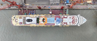 目前艙室、餐飲等區域的內裝工程基本接近尾聲,乘客梯道、影院劇場、中庭廣場、水上樂園、高空繩索運動項目等公共區域建成或基本建成,整體進度達到95%。