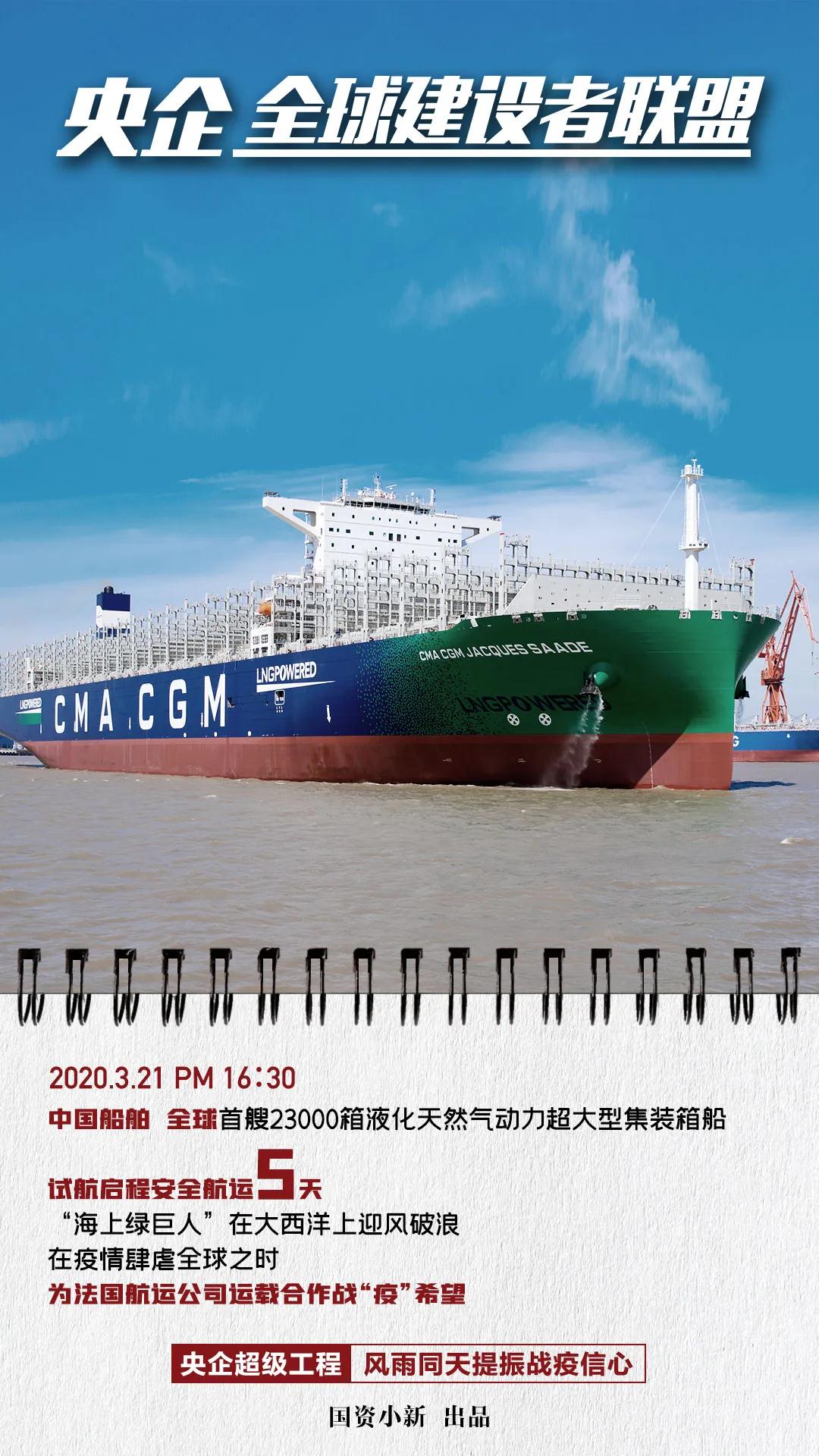 ????今天,國資小新發布圖文消息《央企全球建設者聯盟:風雨同天提振國際合作戰疫信心!》。開篇提到中國船舶集團所屬滬東中華建造的全球首艘23000箱液化天然氣(LNG)動力集裝箱船開啟常規試航之旅,在疫情肆虐全球之時,為法國航運公司運載合作戰“疫”希望。