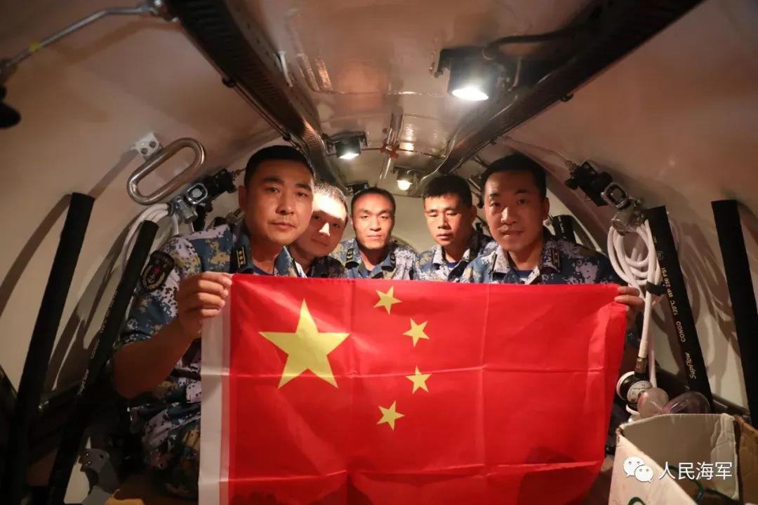經(jīng)過2個小時的緊張下潛,深潛救生艇終于到達,并突破指定極限下潛深度,官兵們展開五星紅旗驕傲地宣布“我的戰(zhàn)位在海底531.1米。