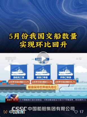 據(jù)統(tǒng)計,截至五月底,中國船舶集團交付新船82艘、598萬載重噸,分別完成年度計劃的42%和43%,為完成全年目標任務奠定了良好基礎(chǔ)。