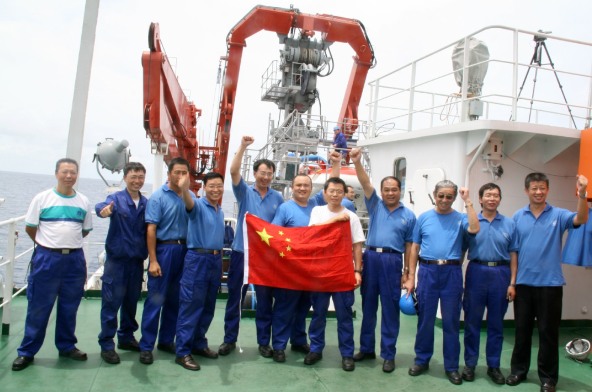 △蛟龍號下潛1000米海試合影 徐芑南(右三)、葉聰(中)