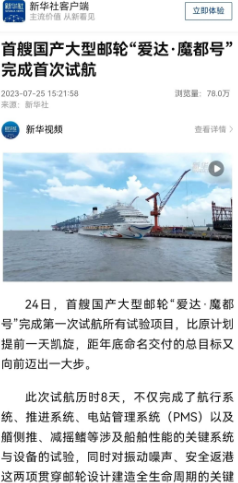 7月24日晚,首艘國(guó)產(chǎn)大型郵輪“愛達(dá)·魔都號(hào)”完成第一次試航所有試驗(yàn)項(xiàng)目比原計(jì)劃提前一天凱旋,人民日?qǐng)?bào)、新華社、中央電視臺(tái)等中央主流媒體進(jìn)行了報(bào)道。